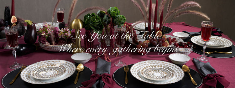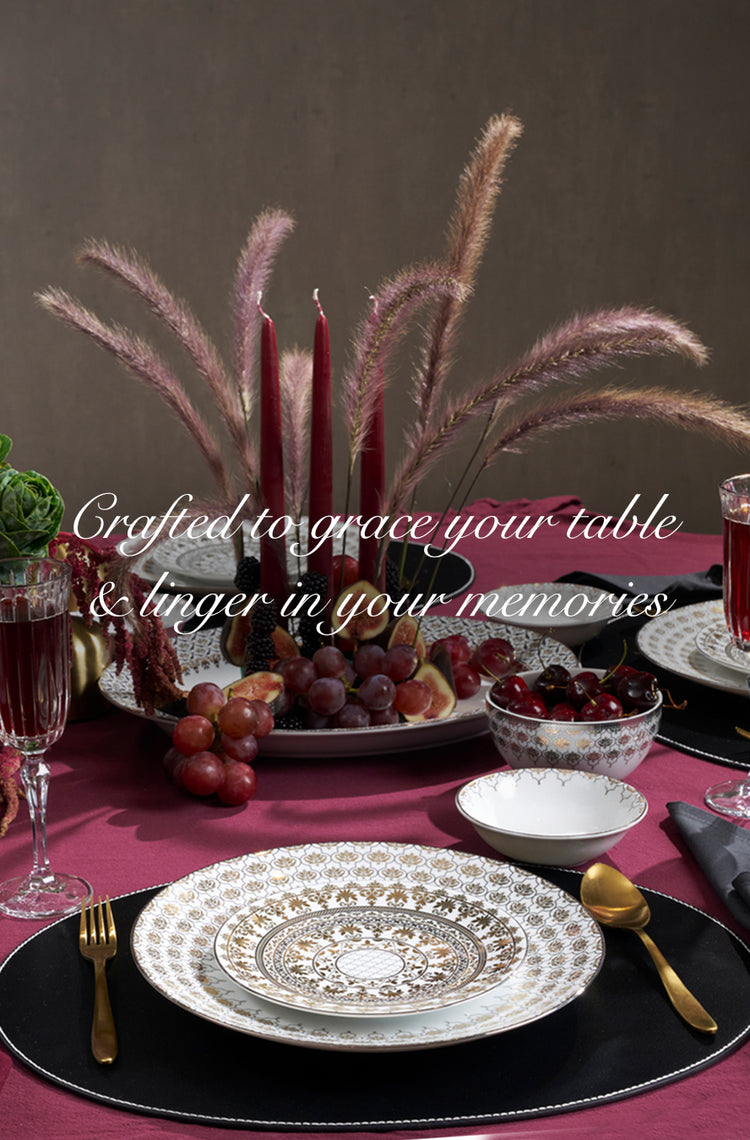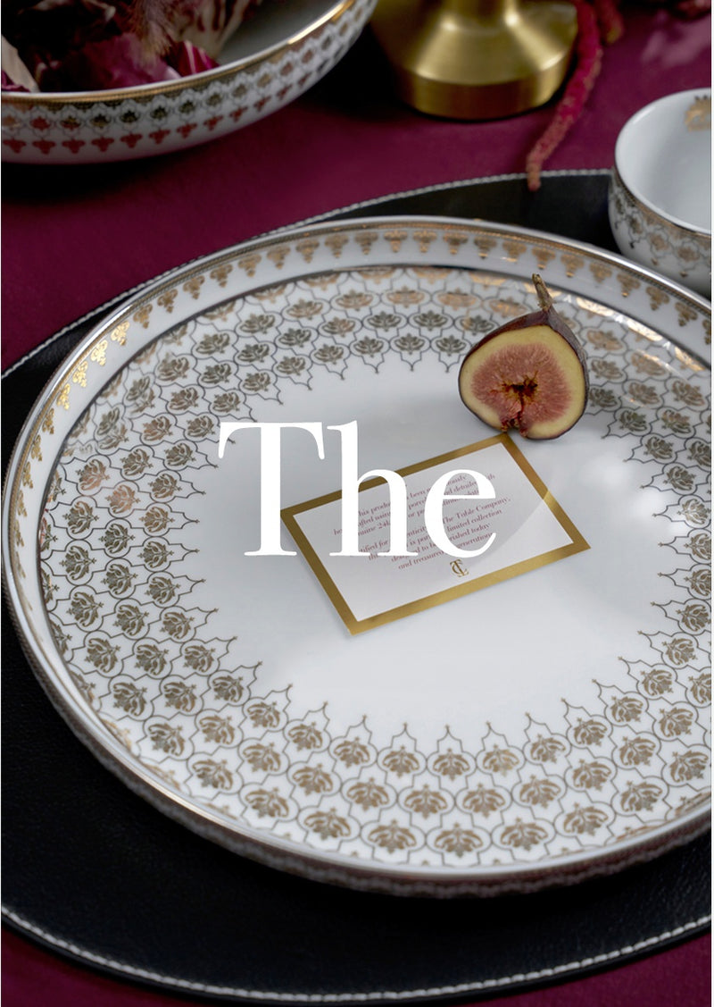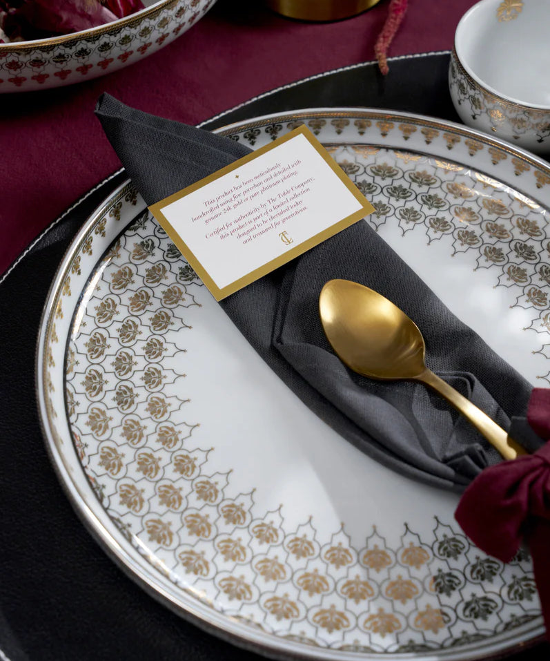 Shop NowA large 12" porcelain round, showcasing intricate gold detailing and platinum lining perfectly complementing each other to transfer every meal into a royal experience.
