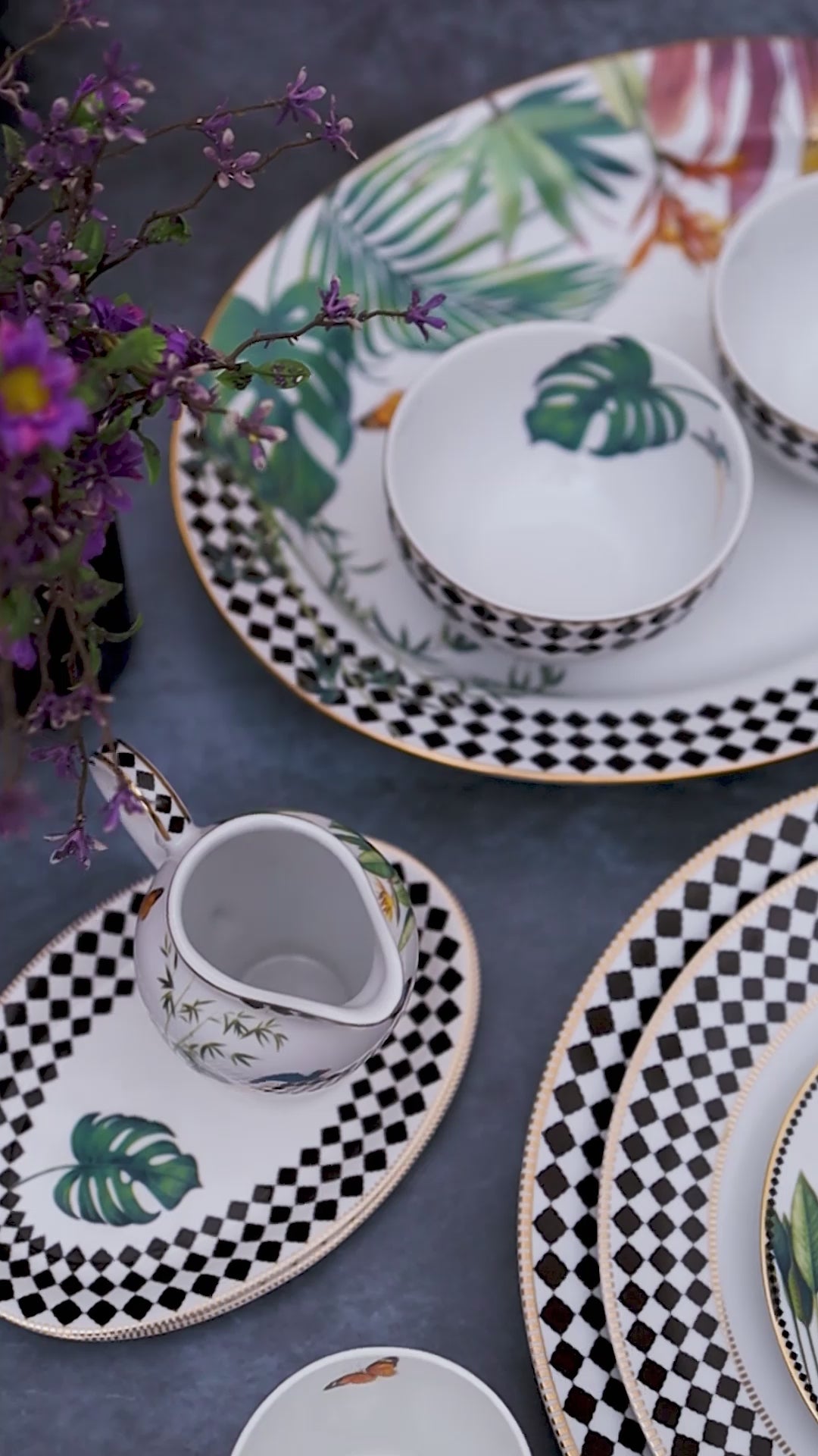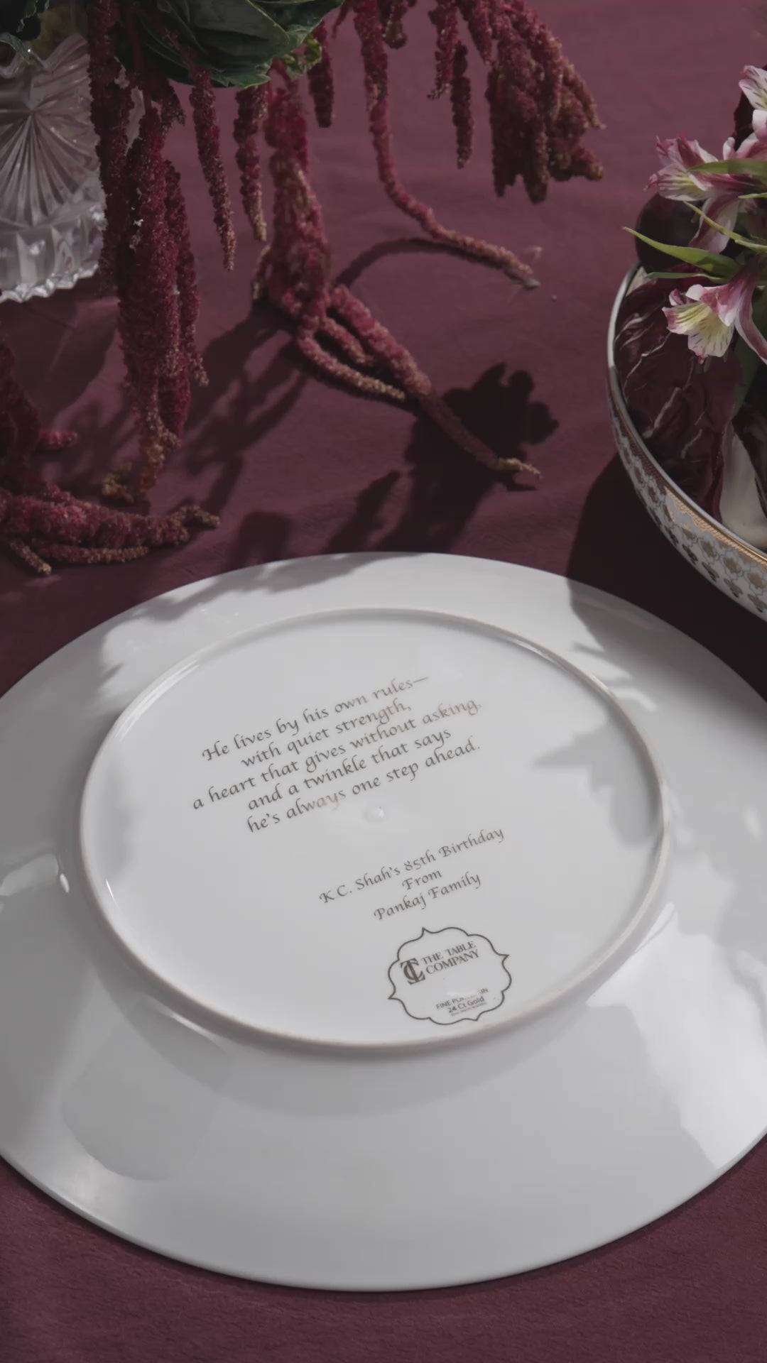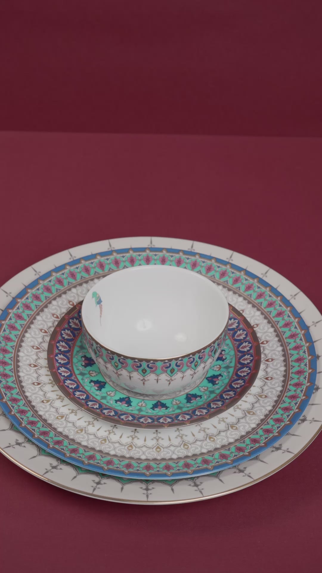Shop NowA large 12" porcelain round, showcasing intricate gold detailing and platinum lining perfectly complementing each other to transfer every meal into a royal experience.