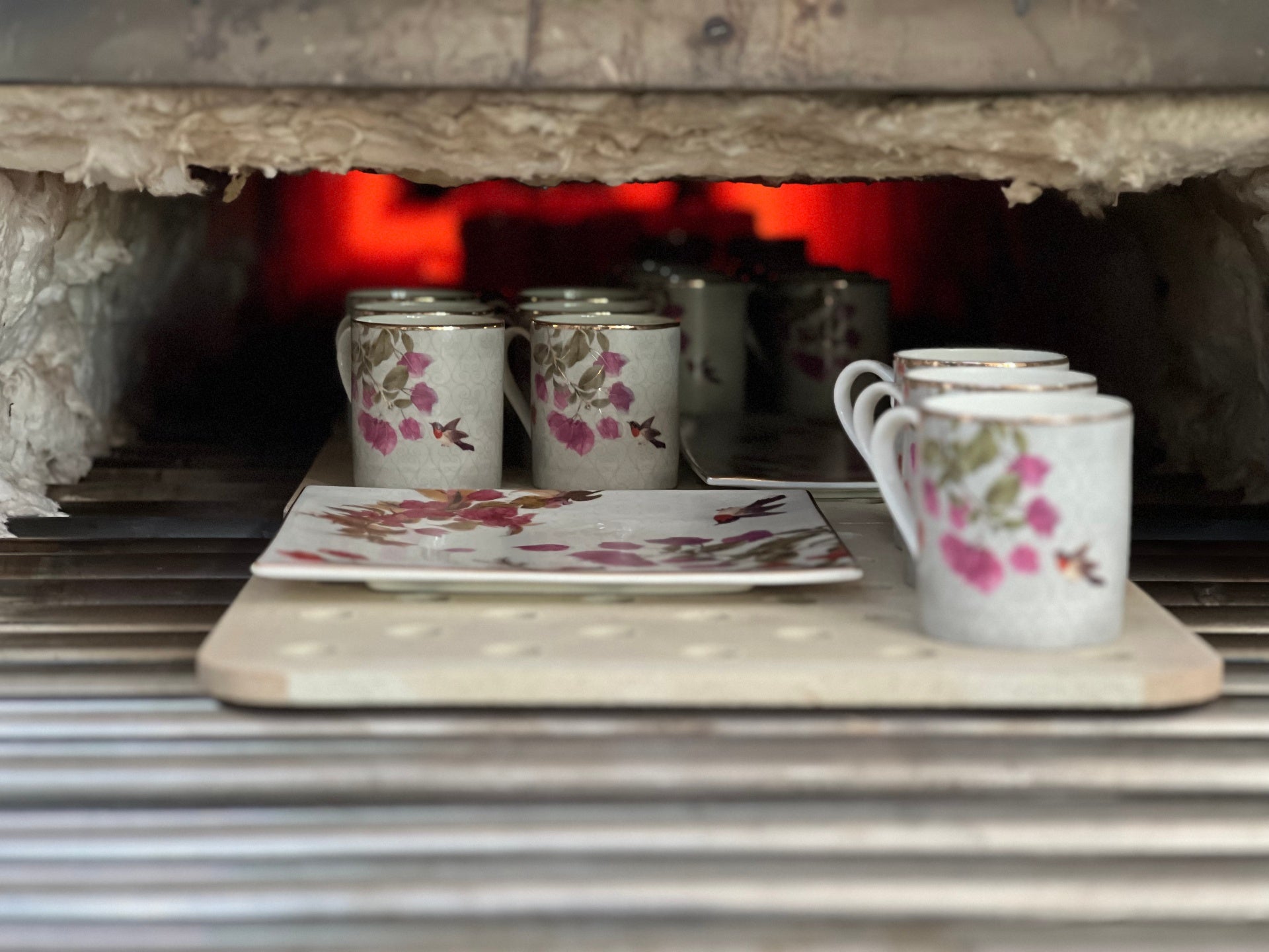For added luxury, select areas of the design is enhanced with gold or platinum accents. These metals are applied in delicate layers or fine lines and then fired at lower temperatures, ensuring they bond securely to the surface without compromising the plate's integrity. The result is a piece that combines durability, elegance and artistry, ready to elevate any dining experience.