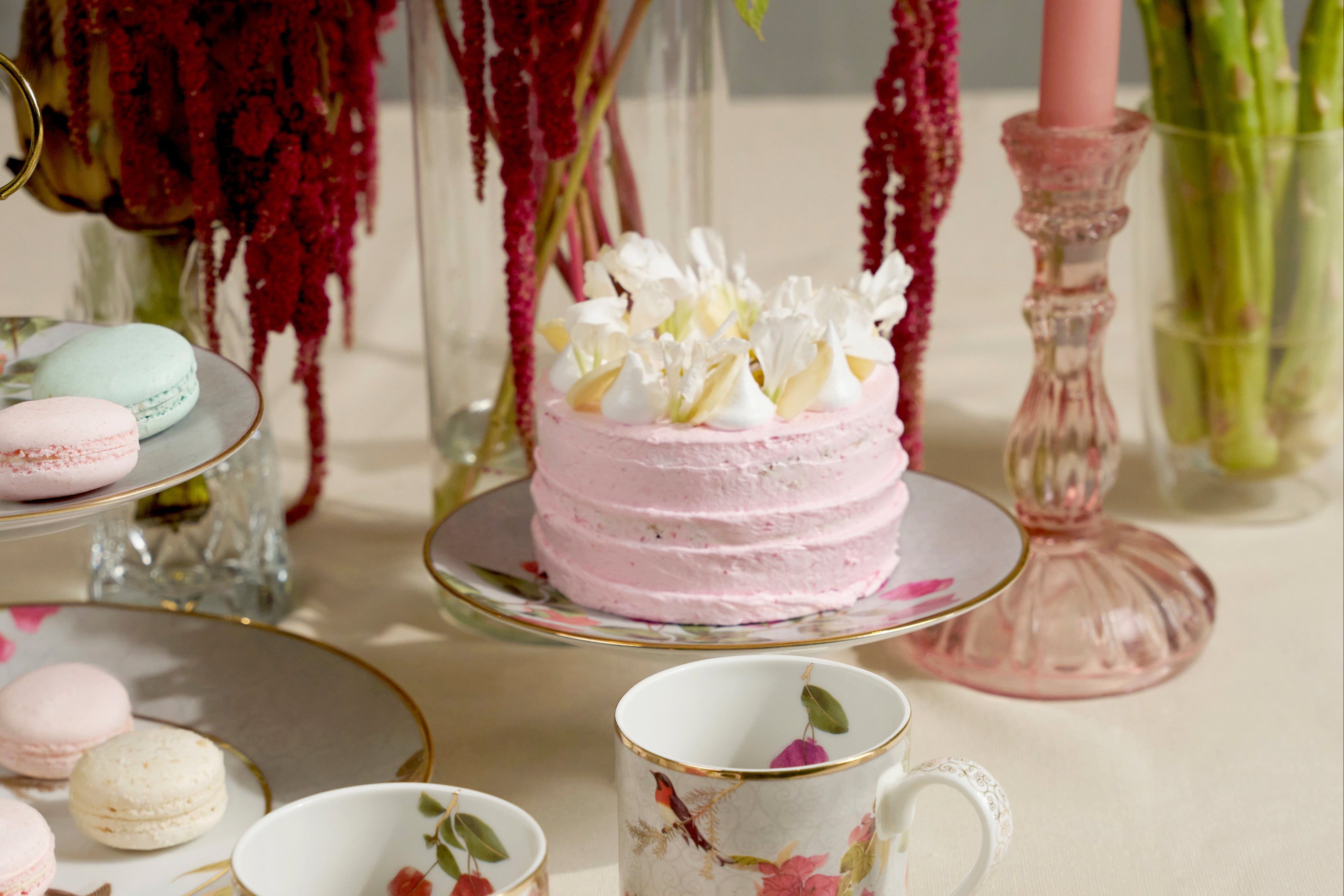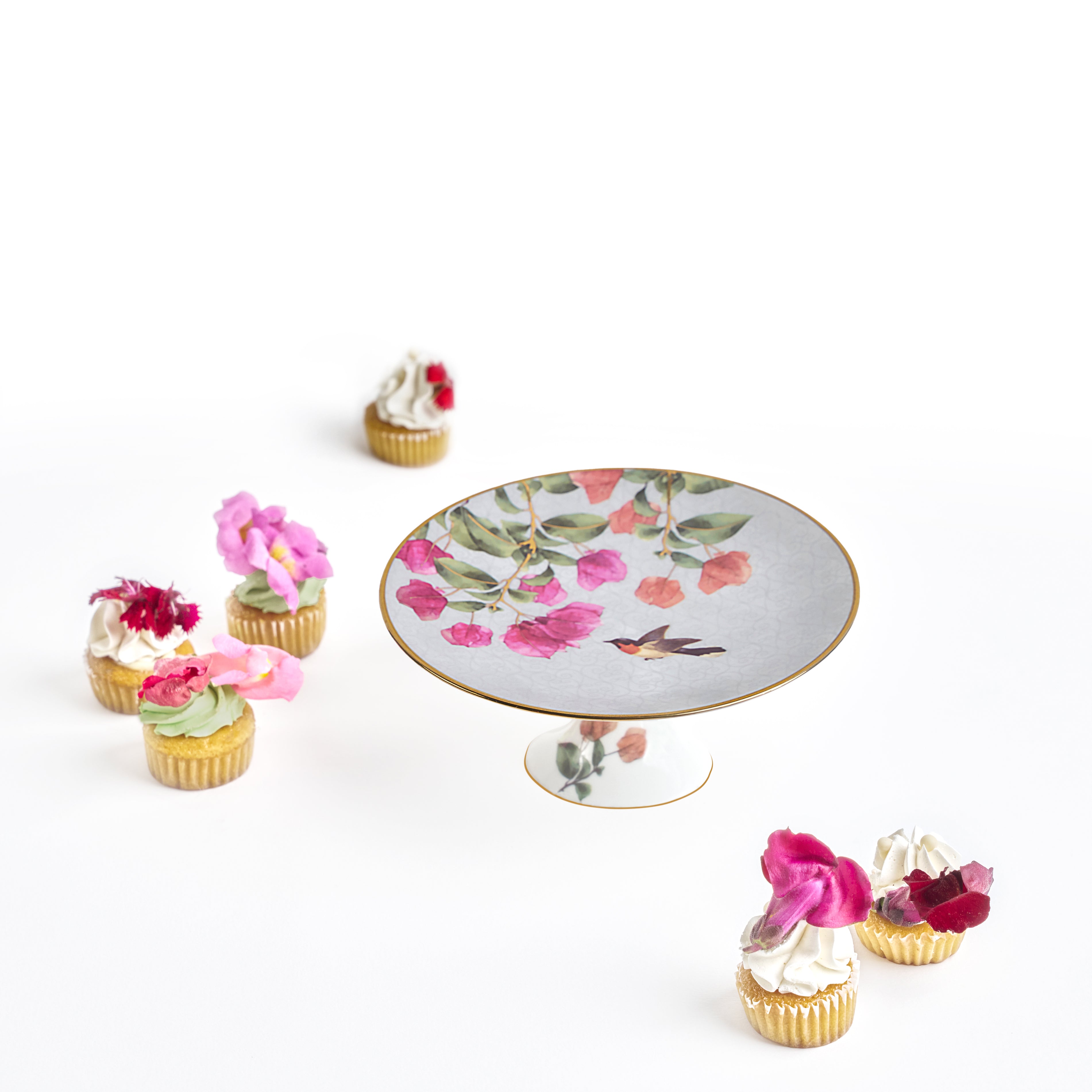 A 7" footed porcelain serving plate inspired by the untamed beauty of bougainvillea and the striking form of the barn swallow bird. Ideal for high-tea setups, showcasing an assortment of sweet and savoury treats and for highlighting your table display at festive celebrations, wedding and showers. A beautiful addition to your luxury serveware collection or for gifting friends and family.