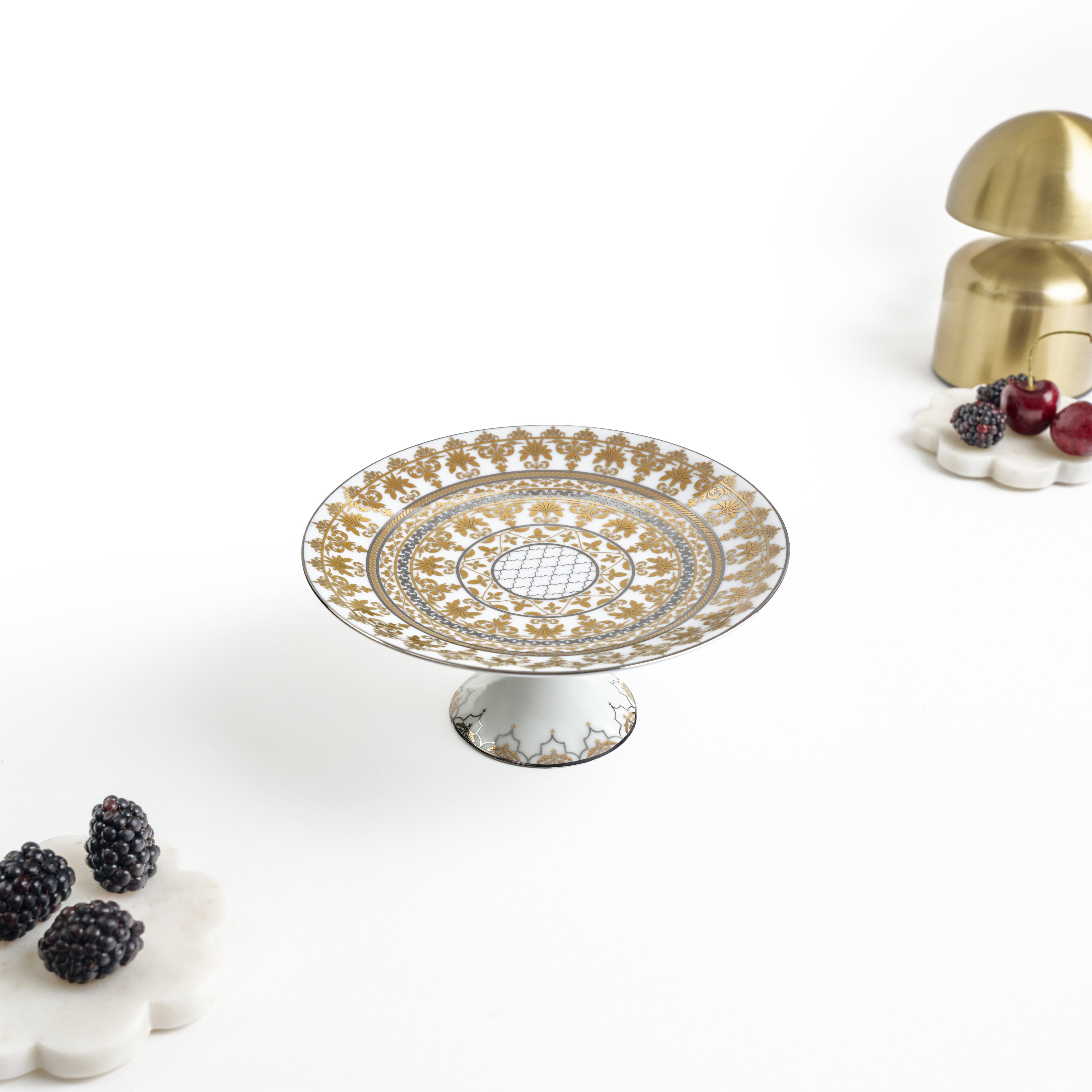 A 7" footed porcelain serving, showcasing intricate gold detailing and platinum lining - perfectly complementing each other to transfer every occasion into a royal experience. Ideal for high-tea setups, showcasing an assortment of sweet and savoury treats and for highlighting your table display at festive celebrations, wedding and showers. A beautiful addition to your luxury serveware collection or for gifting friends and family