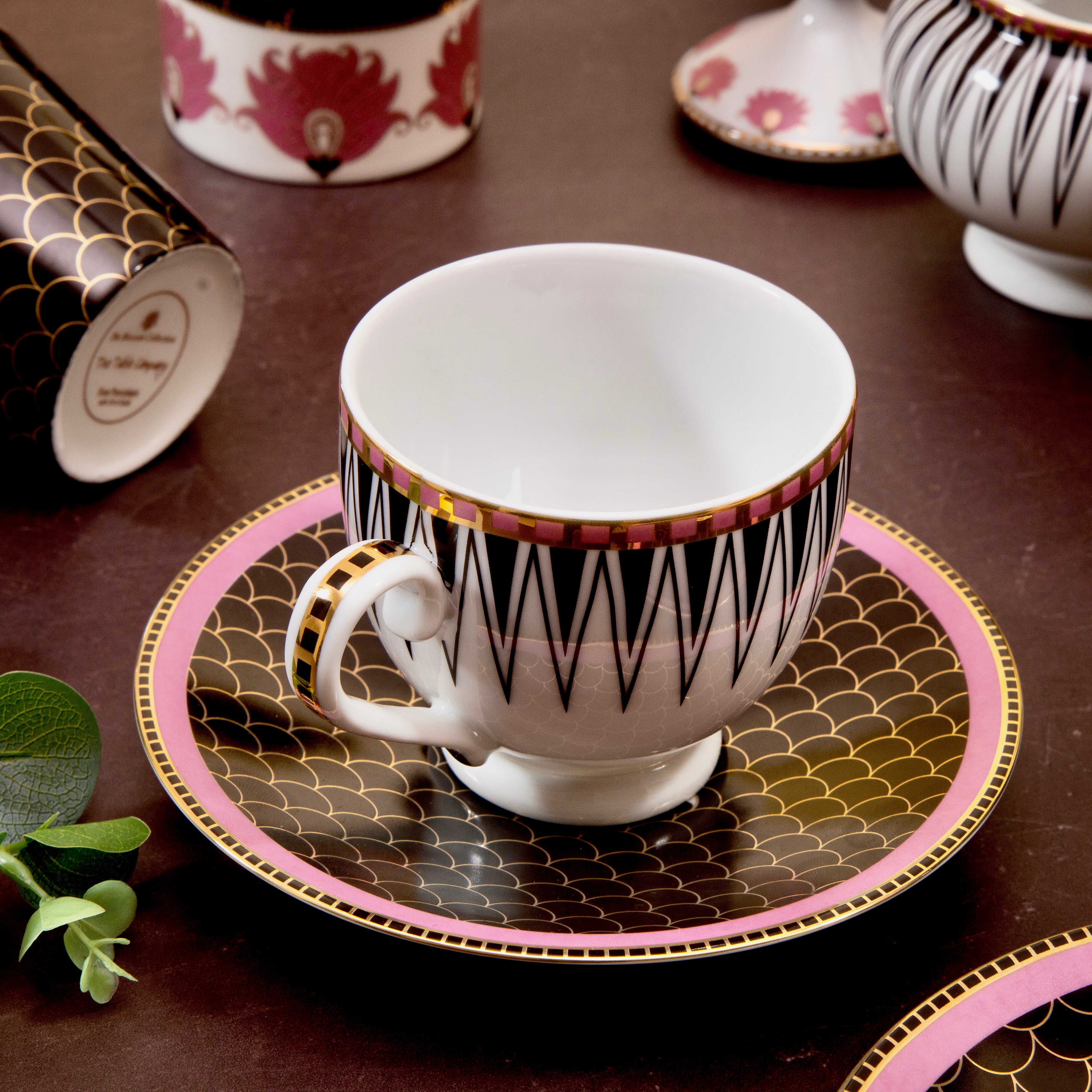 Set of 6 round saucers paired with 6 cups inspired by the delightful and calming nature of the blossoms. Designed with a contemporary flair, the sophisticated palette of black and white, is accented by a distinctive coral hue and intricate 24-carat gold detailing. The cup provides a comfortable and stylish vessel for sipping hot beverages like tea, coffee or herbal infusions - while the saucer catches drips, protects surfaces, and offers space for a spoon or a small treat. Ideal for everyday use, high tea, or formal gatherings, this classic set enhances the presentation and enjoyment of your beverage. This set is a beautiful gifting option for your loved ones.