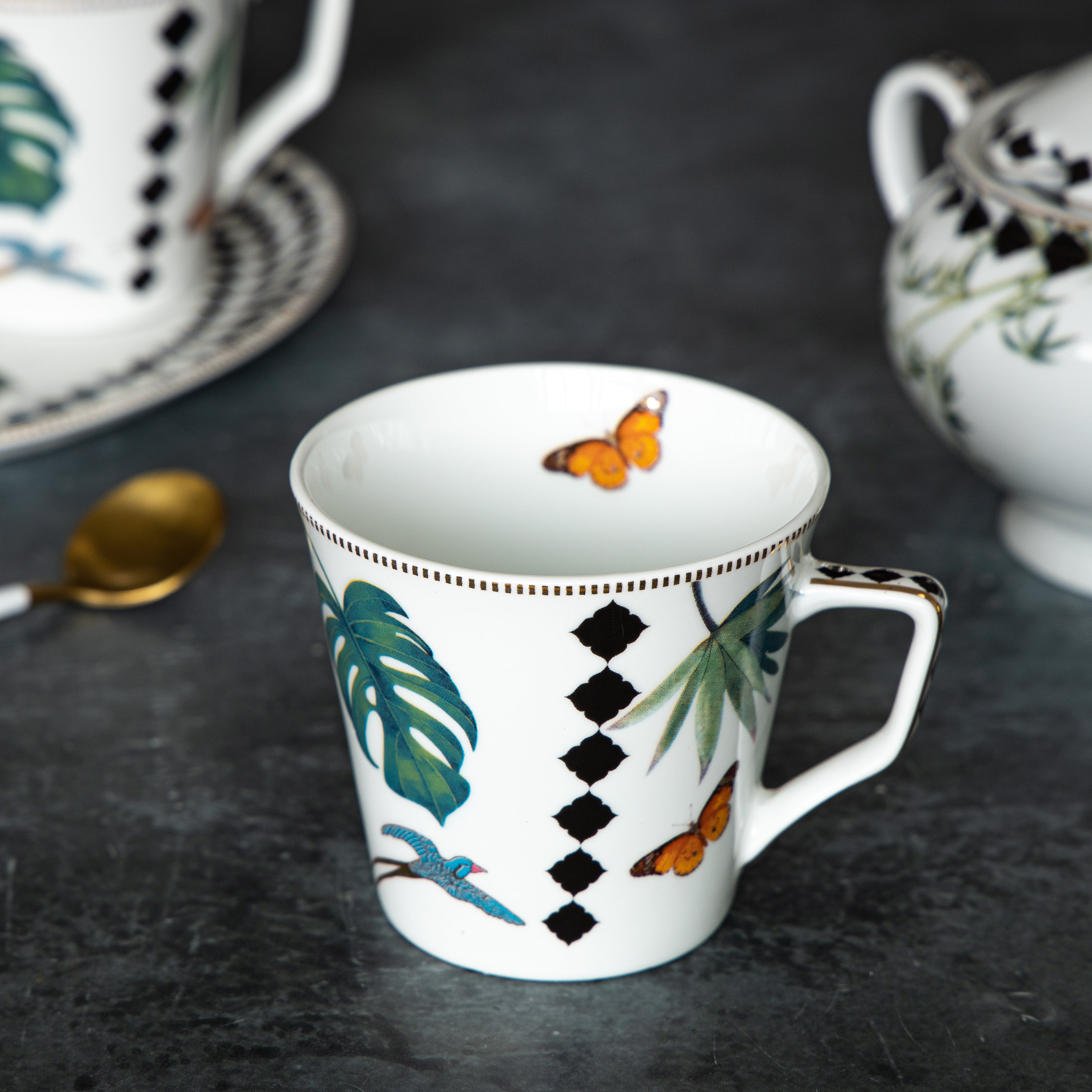 Set of 6 oval saucers paired with 6 cups, intricately handcrafted with gold-plated tropical designs for elegantly serving hot beverages like tea or coffee. The cup holds the drink, while the oval saucer provides space not only to rest the cup but also to hold a small treat like a cookie, biscuit, or sugar cube. This combination is perfect for both everyday use and formal settings, adding style and functionality. This set also qualifies as a beautiful and thoughtful gifting option for your loved ones.