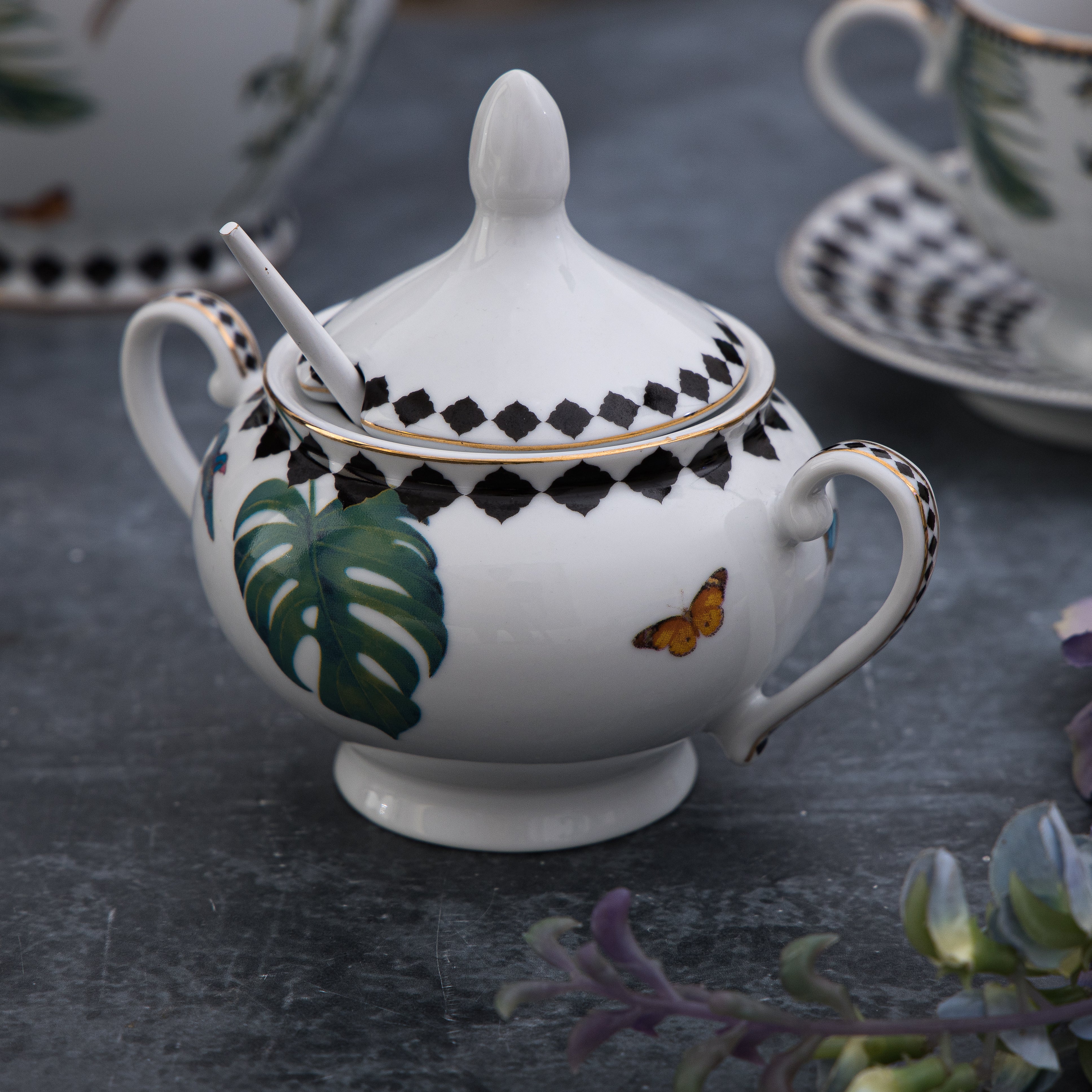 A porcelain tea-set with intricately handcrafted gold-plated tropical design, combining elegance and artisanal craftsmanship making it ideal for formal gatherings or everyday indulgence. The set includes a tea-pot to pour your brews, a milk pot for serving warm or cold milk, and a sugar pot for sweeteners for your beverages. This is also a great gifting option for your loved ones.
